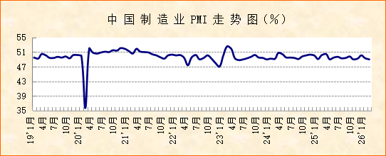 国家统计局服务业调查中心、中国物流与采购联合会发布的2026年2月份中国制造业采购经理指数(PMI)为49%,比上月下降0.3个百分点。